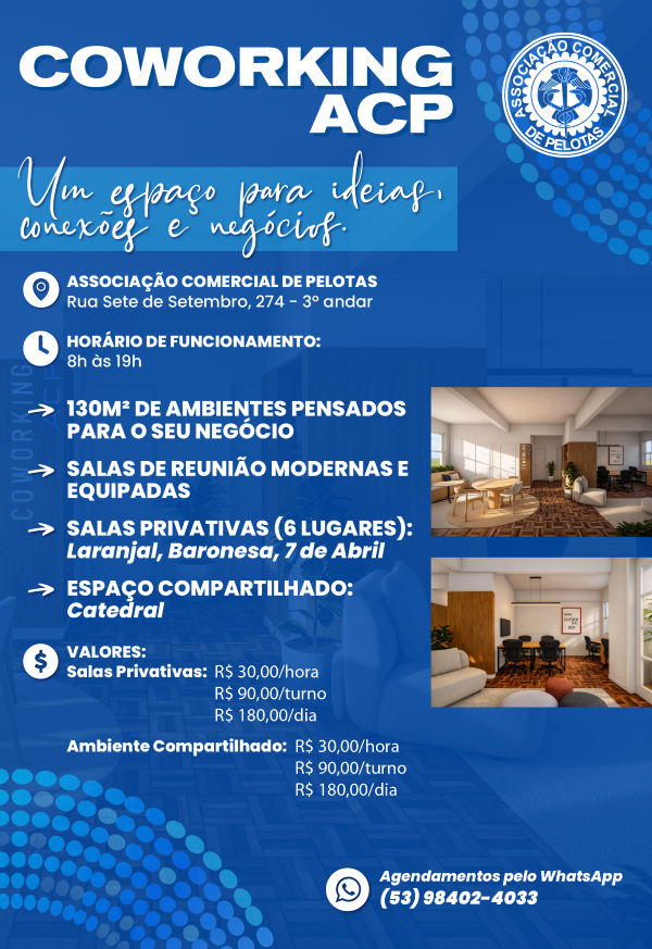 A Associação Comercial de Pelotas (ACP) apresenta à comunidade o Coworking ACP, um novo espaço voltado às conexões e negócios. A iniciativa reforça o posicionamento da entidade como agente ativo no fortalecimento do ecossistema empresarial local e acompanha uma tendência consolidada de ambientes de trabalho compartilhados, cada vez mais presentes nos grandes centros e agora também integrados à realidade de Pelotas.