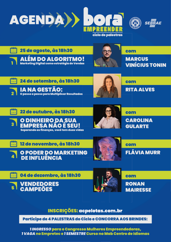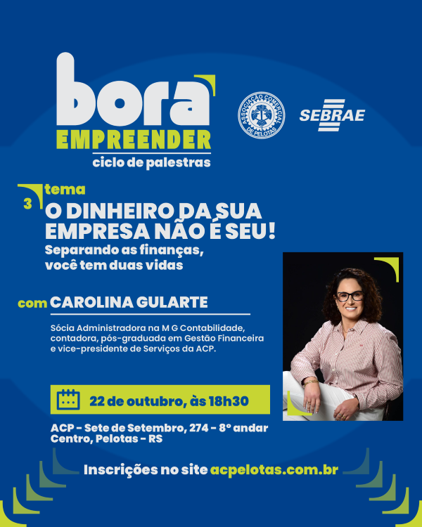 A Associação Comercial de Pelotas (ACP) e o Sebrae/RS promovem no dia 22 de outubro, às 18h30, a terceira palestra do ciclo “Bora Empreender”, projeto lançado neste ano para fortalecer o empreendedorismo local por meio de capacitações práticas e temáticas atuais. O encontro terá como tema "O dinheiro da sua empresa não é seu! Separando as finanças, você tem duas vidas", ministrado pela contadora e vice-presidente de Serviços da ACP, Carolina Gularte.