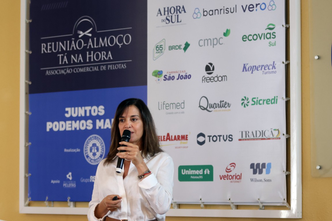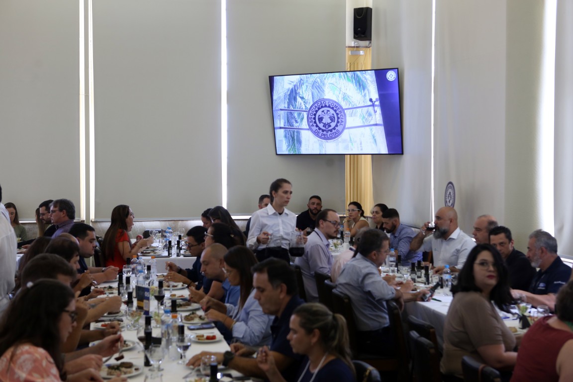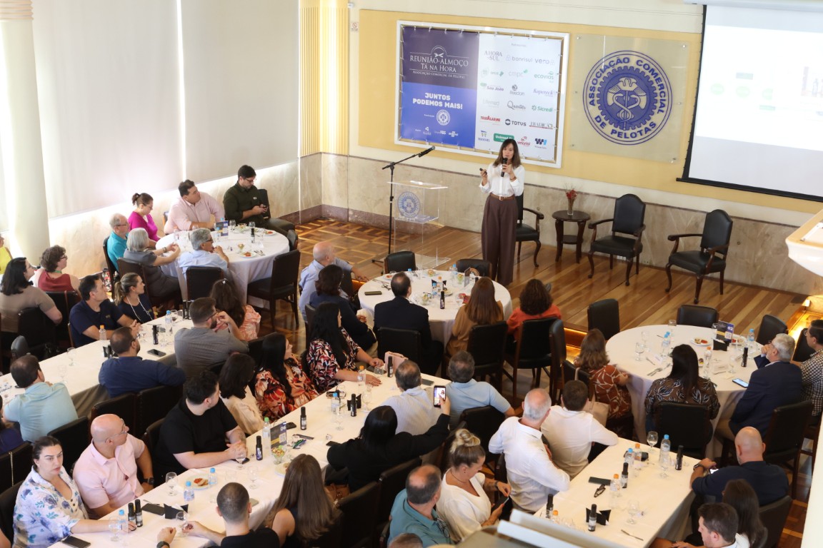 A Associação Comercial de Pelotas realizou, nesta quinta-feira, 19 de março,  a primeira edição de 2026 da tradicional Reunião-Almoço Tá Na Hora. O encontro, que reuniu cerca de 120 participantes no Salão Mauá - Sede da ACP, teve caráter especial em alusão ao Dia da Mulher e recebeu como convidada a sommelier de azeites e Mestra de Lagar Cláudia Santos, da Fazenda Serra dos Tapes.