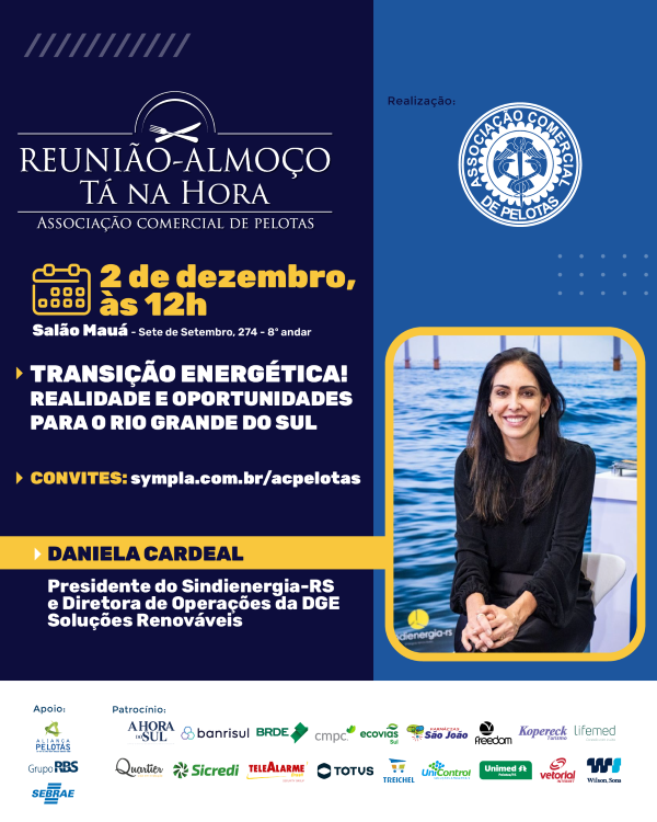 A última Reunião-Almoço Tá na Hora de 2025 coloca em pauta um dos temas mais estratégicos do momento: a transição energética. No dia 2 de dezembro, às 12h, a Associação Comercial de Pelotas recebe Daniela Cardeal, presidente do Sindienergia-RS e diretora de Operações da DGE Soluções Renováveis, para uma análise objetiva sobre os avanços do setor e as oportunidades para o Rio Grande do Sul. Com ampla atuação no desenvolvimento de projetos e na consolidação de políticas de energia limpa, Daniela trará um panorama das transformações em curso e das possibilidades de investimento e crescimento para empresas da região.