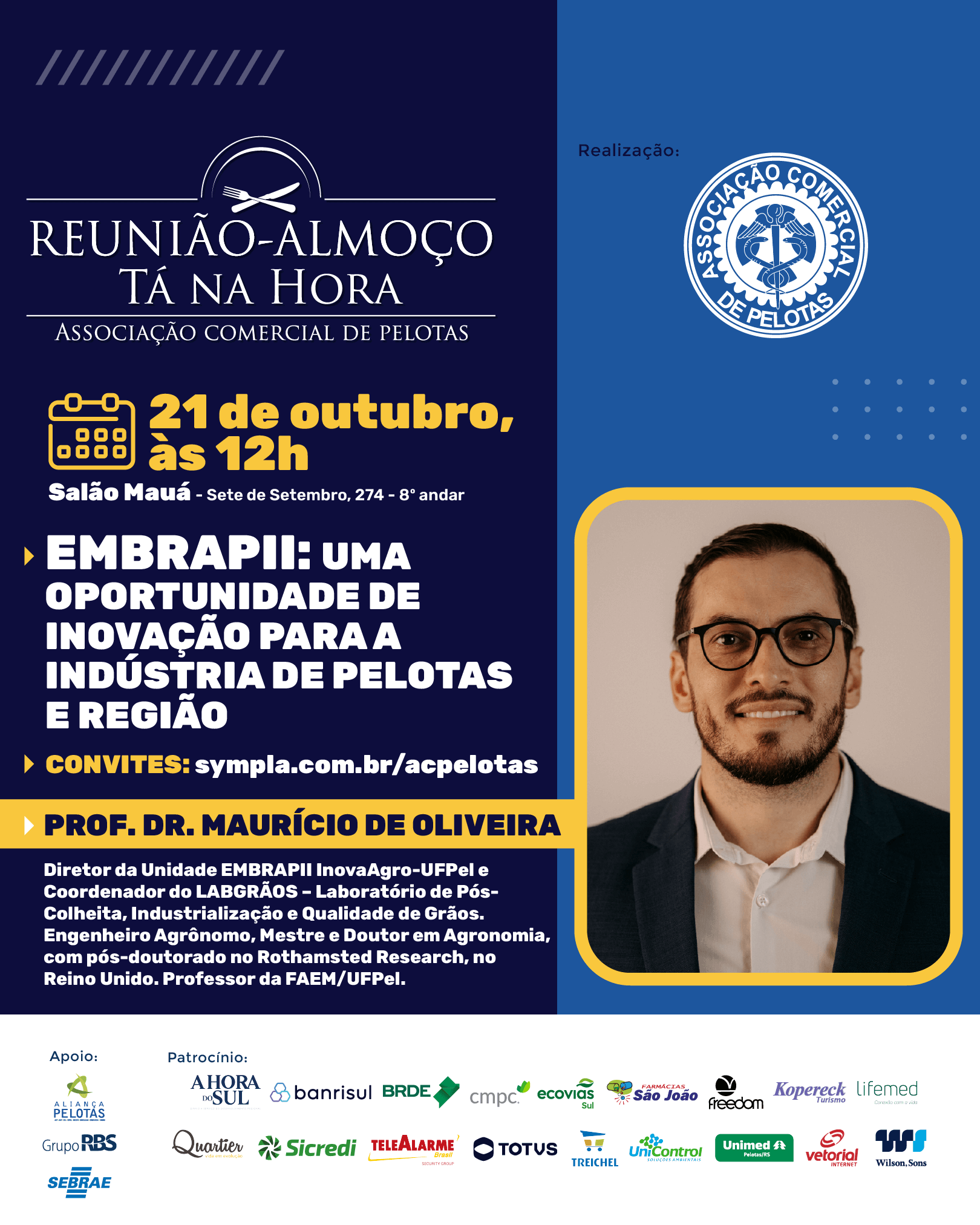 No dia 21 de outubro, às 12h, a Associação Comercial de Pelotas - ACP realiza mais uma edição da Reunião-Almoço Tá na Hora, recebendo o Prof. Dr. Maurício de Oliveira, Diretor da Unidade EMBRAPII InovaAgro-UFPel, para falar sobre como a inovação pode impulsionar a indústria de Pelotas e região.